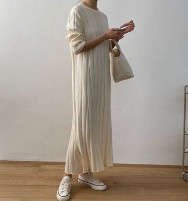 幅の広いリブ加工が施されたニットワンピースは、縦ラインが強調されてスッキリ見えが叶います。広がりすぎないシルエットと、くるぶしまであるマキシ丈が今っぽさ抜群♪