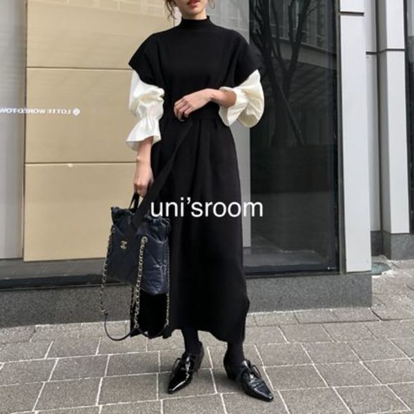 半袖のニットワンピースとブラウスがセットになったお得感満載のワンピース♡ボリューム袖のブラウスは、シンプルなので他のスタイリングにも合わせやすいです。