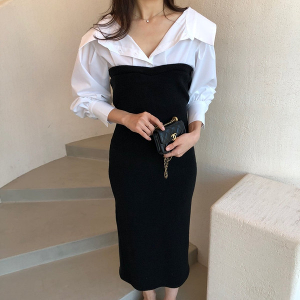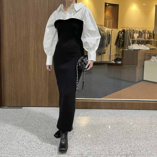 ドッキングされたワンピースなら、重ね着が苦手な人にも◎バルーンスリーブでこなれ感が漂うシャツは、タイトなビスチェでボリュームを抑えて華奢なラインを作ります。