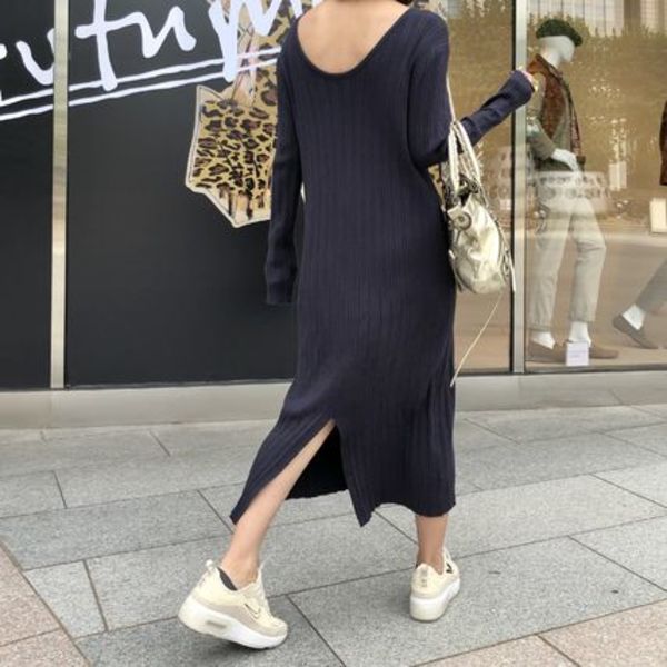 トレンドのバックシャンデザインは、ニットワンピースでラフに取り入れて♡ストンとしたストレートラインと裾のスリットが色っぽく、カジュアルにもエレガントにも着こなせます。