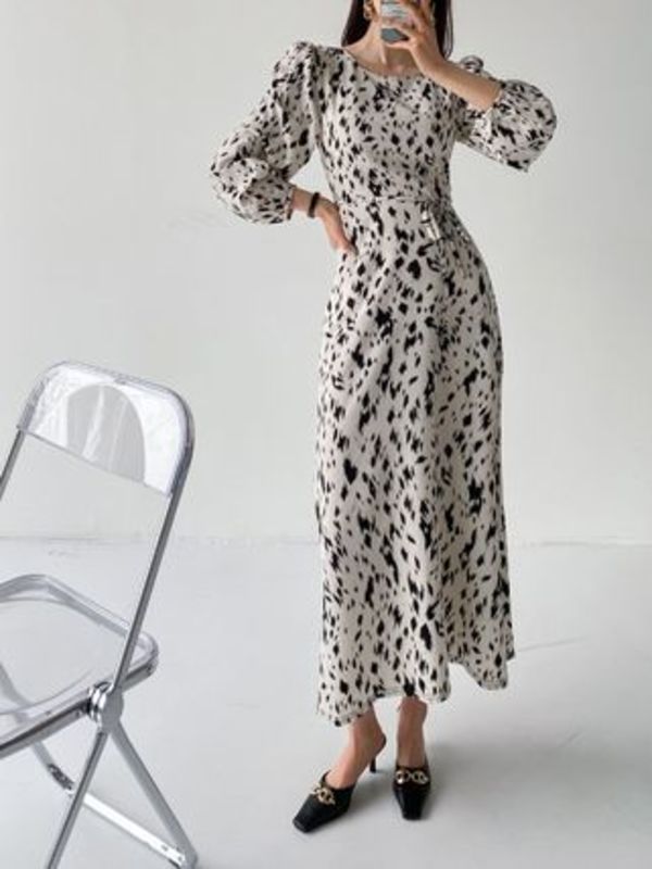 ダルメシアン柄のようなプリントが上品な総柄ワンピース♡ざっくりとしたパフスリーブが大人可愛く、華奢なウエストリボンが美しいシルエットを強調します。