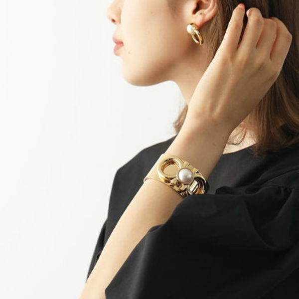 ガンチーニモチーフとガラスパールのアームカフ。品の良さを漂わせつつ、重厚感のあるデザインがアクセントに。