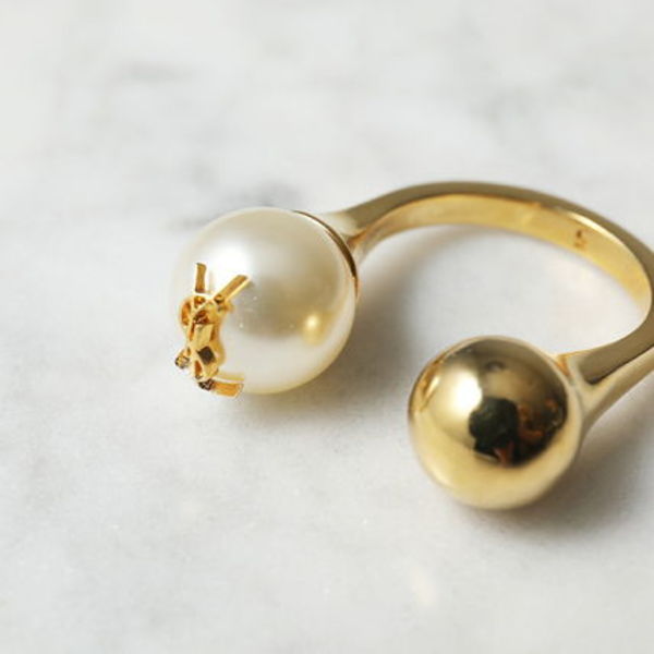 パールとボールのオープンカフリング。パール部分にはメタルのYSLロゴが配されているので、見るたびに気分も上がる。
