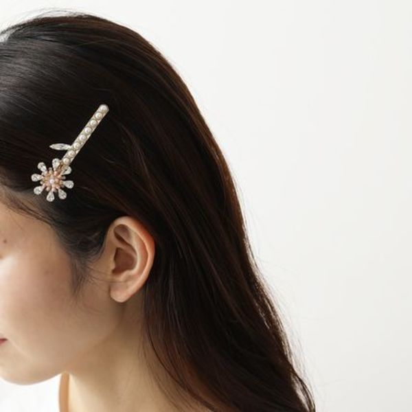 クリスタル装飾をあしらったフラワーモチーフとパールの組み合わせが印象的なヘアクリップ。ヘアスタイルにアクセントを与え、美しさを引き立ててくれます。縦2.5cm、横6.5cmで存在感たっぷり。