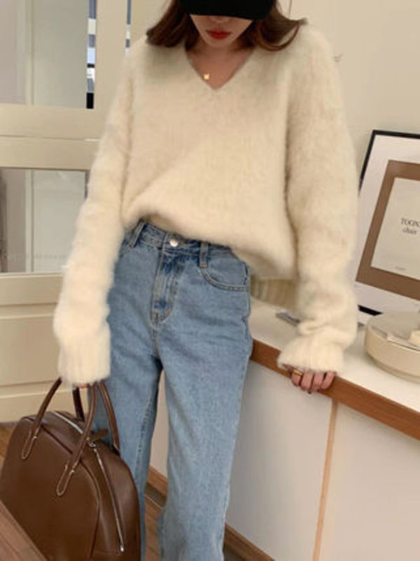 毛足の長いモヘアニットなら、さらにフェミニンな印象に。あざとさNo.1の白なら、コーデを選ばず着回したい旅行シーンにも最適です。