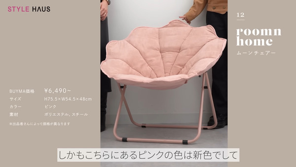 韓国ブランド「ルームアンドホーム」からは、ヒット商品の“ムーンチェア”をご紹介。こちらは新色のピンクで、部屋にも馴染みやすいデザイン。簡単に折りたたむことができ、省スペースで楽しめるのも魅力。スエードのような素材で、高級感も抜群。
