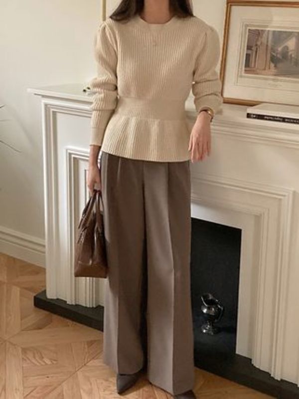 1つ目のオススメは、シルエットのお洒落さを全面に出したペプラムシェイプニット。シンプルなデザインでありながら、ユニークなペプラムは1着で全体のコーディネートをグッと格上げしてくれるのでおすすめです。
