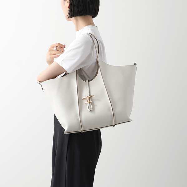 程よい光沢のある上質なレザーにリブを付け、しなやかな曲線を描くショッピングバッグ。トッズ の「T 」メタルのアクセサリーが存在感をプラスしてくれます。取り外し可能なポーチが付いていて、大きいと難しい中身の整理も出来るので、とても実用的です。
