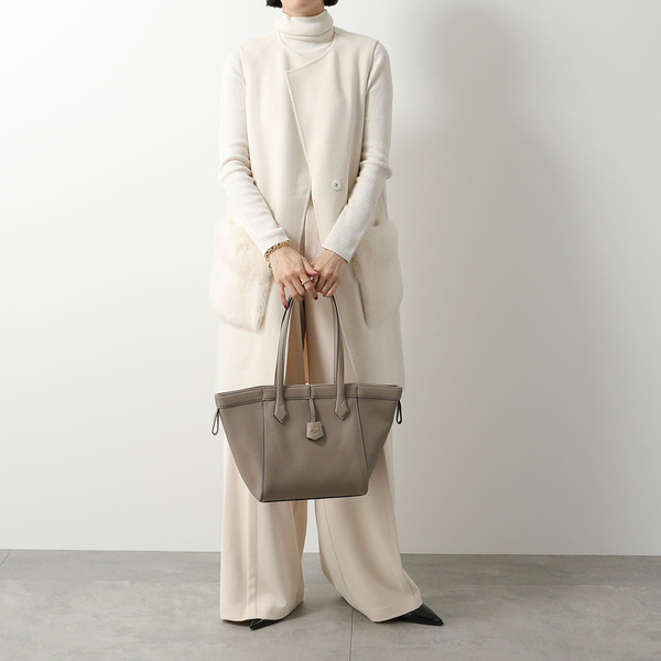 異なる二つの質感のレザーを使用しており、シンプルながら存在感のあるトートバッグ。ハンドバッグとしてもクロスボディバッグとしても使える多機能性。エレガントで洗練されたスタイルに仕上がります。