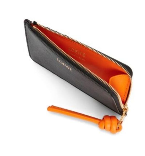 二つ折り財布はラウンドファスナー型で、サイズの詳細は、9.5×12.2×1.4と超薄型!別カラーの‟ノット”がモダンに主張し、ゴールドで箔押しされたブランドロゴが映えるシックなお財布となっています。