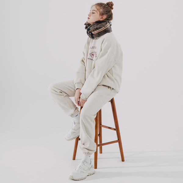 「THE MOZZ(ザモズ)」のスウェットセットアップ。ゆるりとオーバーサイズのシルエットですが、トップスがクロップド丈なので野暮ったく見えずトレンド感のある着こなしが叶います。真冬はダウンやムートンブーツを合わせると韓国風ルックに♪