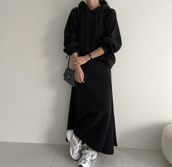 ゆるりとしたフーディーは、前だけボトムスインするとさりげなくメリハリがついて着太り知らずに。思い切ってスニーカーでリラックスさを引き立てましょう。