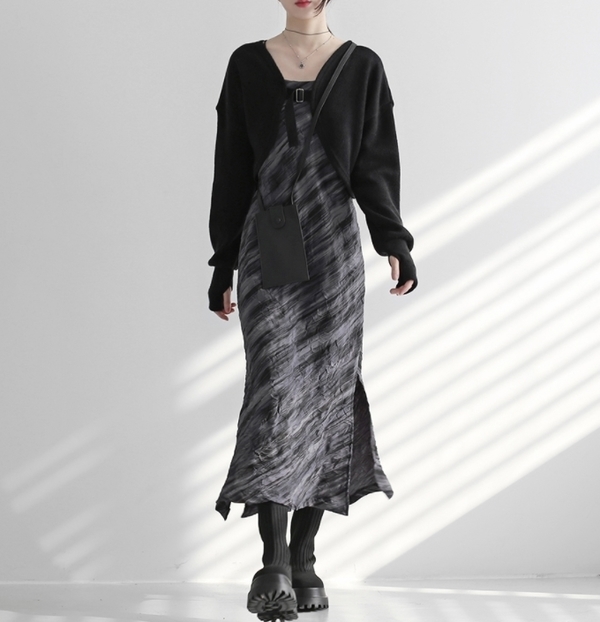 スカートよりもパンツのほうが得意なイメージがありますが、このワンピースはシルエットが直線的で、色がモノトーンなので、かわいらしいテイストが苦手なクールカジュアルさんでもかっこよく着こなすことができます。柄も丸みがないのがポイント。きりっとしたお顔立ちに合わせて柄も直線的だととても似合います。