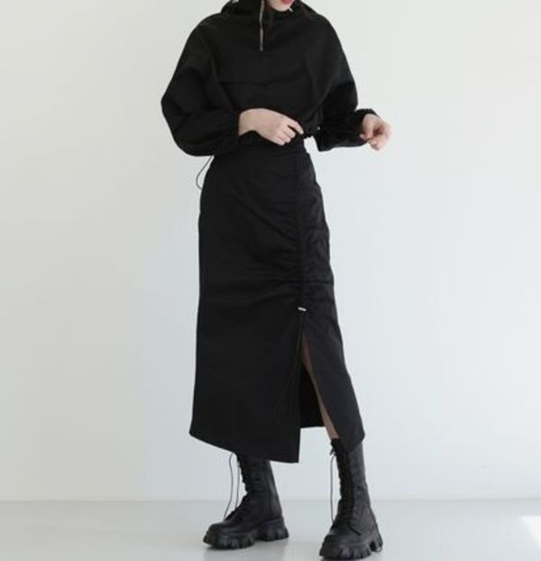 モード感漂うスタイリッシュなセットアップ。ナイロン素材で天気も気にせず外に出られるので、これから梅雨のシーズンも重宝しそう。