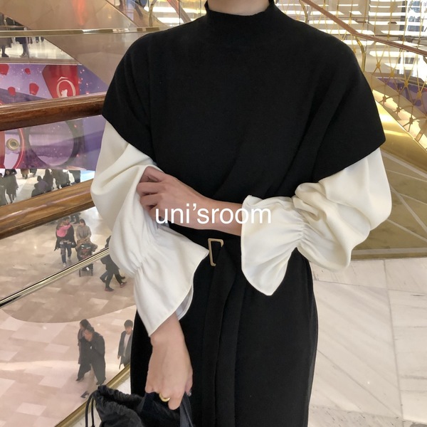 ブラウスとセットになったニットワンピース。マタニティウェアとしても着られるゆったりした着心地で、見た目以上にリラックスできそう。