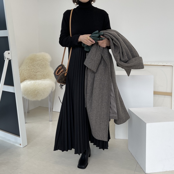 ニットワンピースもリブやプリーツが入るだけで、部屋着感が無くなり一気に女性らしいフェミニンな印象に仕上がります。