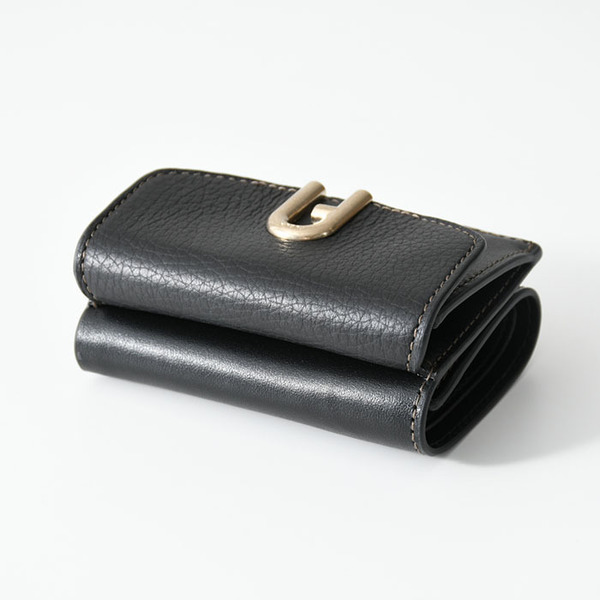 ▼サイズ縦7㎝横9.5㎝とコンパクトに仕上げられた三つ折りのウォレット。フロントにあしらったメタルのアーチロゴとブランドロゴの刻印がアクセントになり個性的な印象に。