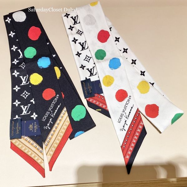 マルチカラードットとモノグラムパターンが贅沢にプリントされたスカーフバンド。ベースカラーが白と黒の2色から選ぶことができます。