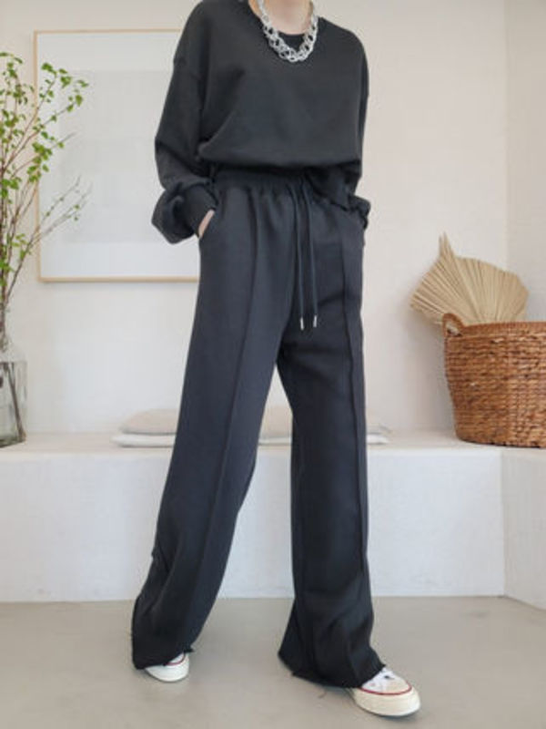 ダボつかないサイズ感でオシャレに着れるスウェットセットアップは、綿素材で春夏にぴったり。パンツにセンタープレスデザインがあることで、きっちり感と脚長効果もあります。