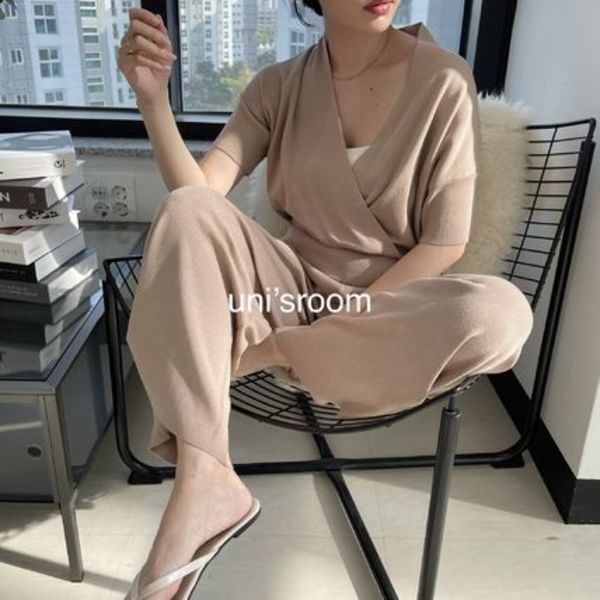 一気にトレンド感のあるコーデが完成する、リラックスムード漂うサマーニットセットアップ。ラップデザインの半袖ニットとワイドパンツは大人な印象で、ラウンジウェアとしても活躍間違いなし。