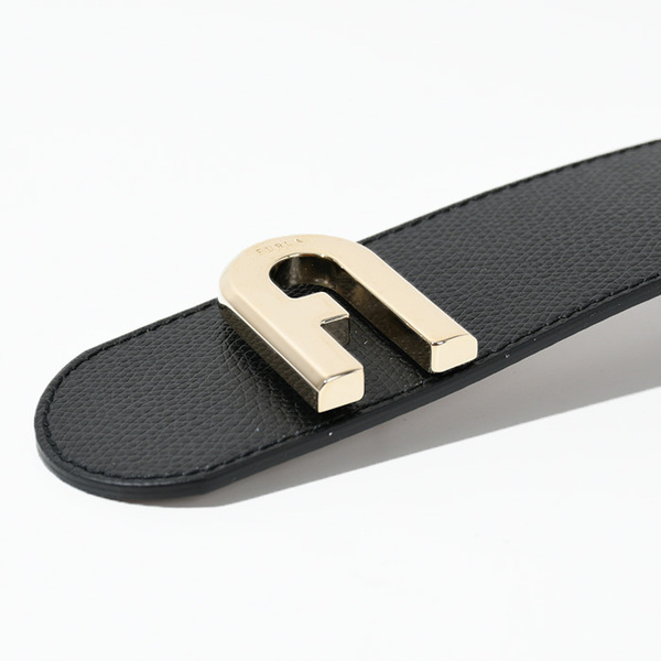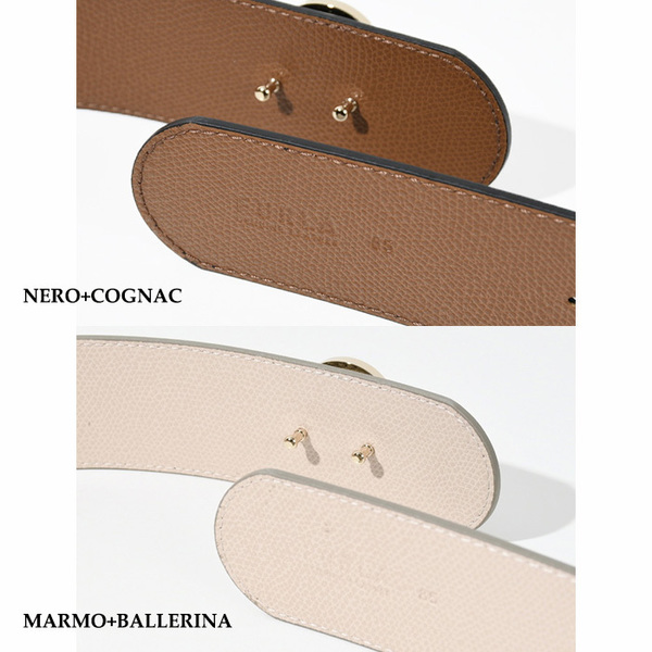 2色の滑らかで柔らかなレザーを使用したリバーシブルタイプのベルト。開閉はダブルカフリンクで使いやすい仕様です。太めのベルト幅にフルラ アーチ ロゴがあしらわれており、ワンピースやワイドパンツなどのアクセントとなるアイテムです。