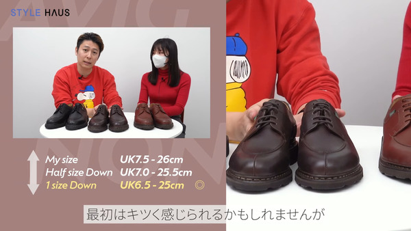 「Paraboot(パラブーツ)」のシューズは少しサイズが大きく感じたので、普段履いているサイズをUKのサイズにそのまま置き換えて選ぶとかなり大きくなってしまうと思います。サイズ選びの際は、ハーフサイズもしくはワンサイズ落とすのがおすすめです。