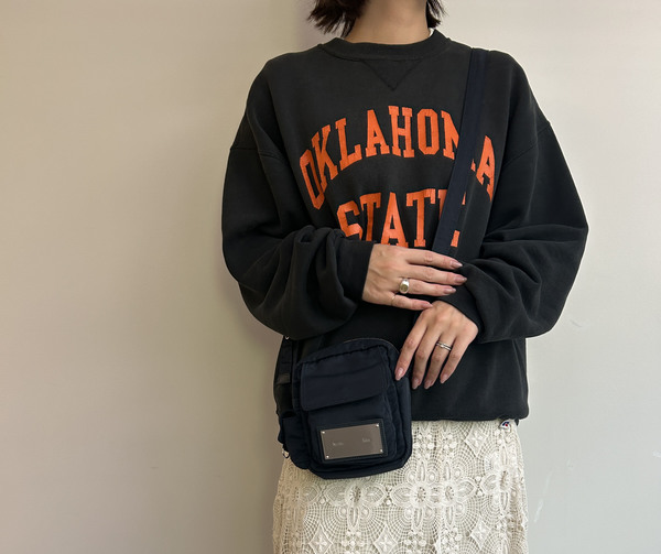 定番の形ですが、クッションのようにふんわりとしたナイロンの素材感が洒落てるショルダーバッグ。ニュアンスのきいたカラーはカジュアルコーデはもちろんフェミニンなコーデにもマッチしやすいです♪