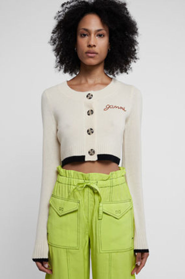 ニット帽やセーターなどバズりアイテムが次々と登場している「Ganni」♡クロップド丈のカーディガンは、大きめのボタンがユニークでシンプルながら遊び心を感じるデザインに。トップスとしても羽織としても使えて重宝します。