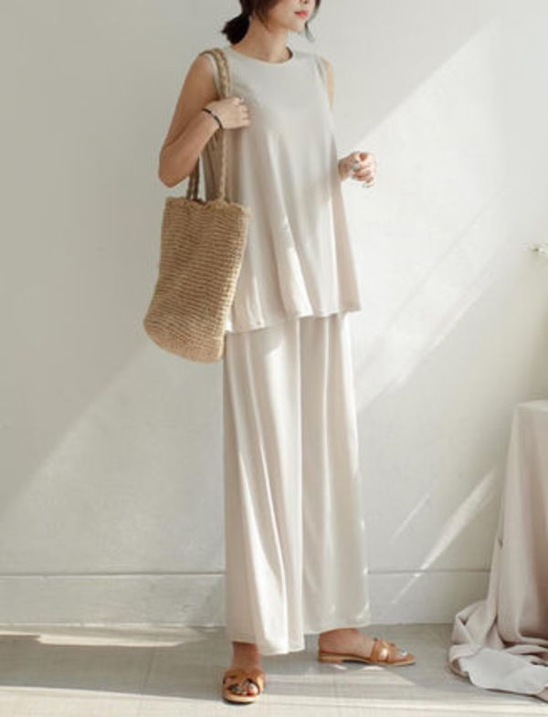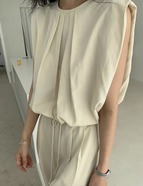 ドレープが入ったデザインの上品なセットアップ。ノースリーブで涼し気ながら、二の腕もしっかりカバーできます。