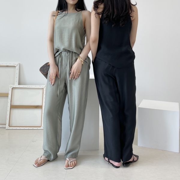 サテンのような艶と質感のあるセットアップなら、上品なセクシーさとリラックス感を兼ね備え、女性の魅力を引き出してくれます。