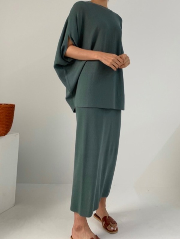 ニット素材のセットアップで上品なモードスタイルの完成◎合わせる小物次第でオンでもオフでも活躍しそうです。