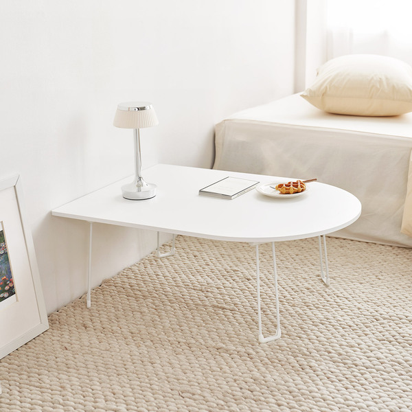 壁にぴったりと付けられ、場所を取らない半円型の折りたたみローテーブル。テーブルライトを置けばカフェのような雰囲気に。子供部屋に置いても可愛らしいテーブルです。