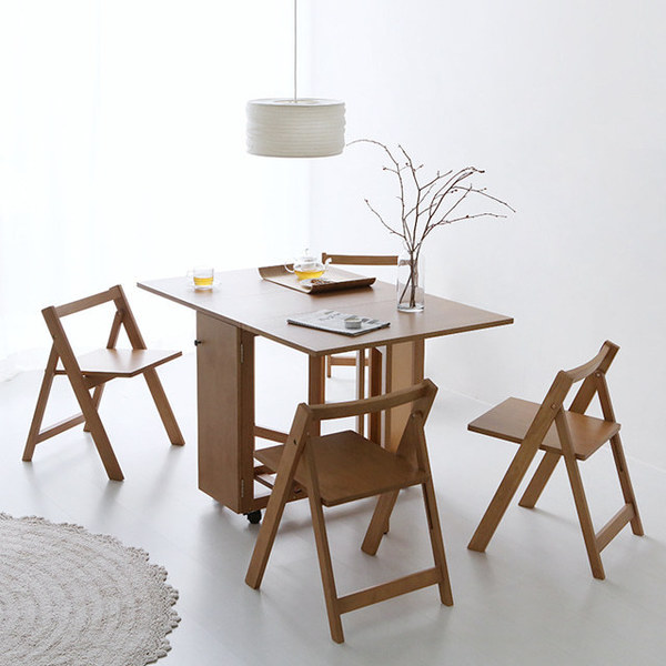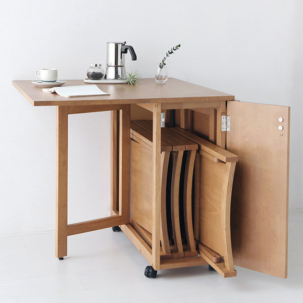 こちらは椅子が収納できる、「MARKET B(マーケットビー)」の折りたたみテーブルと椅子4脚のセット。椅子を収納してテーブルを折り畳めばコンパクトなサイズになるので、空間を上手に活用できますよ。カラーはナチュラルなベニヤとミドルブラウンの2色から選べます。