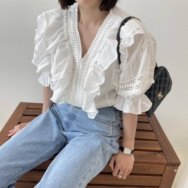 綺麗なVネックラインでデコルテまわりをすっきりとさせつつ、肩や胸まわりをフリルでボリュームを持たせることで、二の腕やお腹まわりをふんわりカバーしてくれるトップスです。デニムなどカジュアルなアイテムとも好相性なので、シーンを選ばず着まわせるのも嬉しいポイントですね!