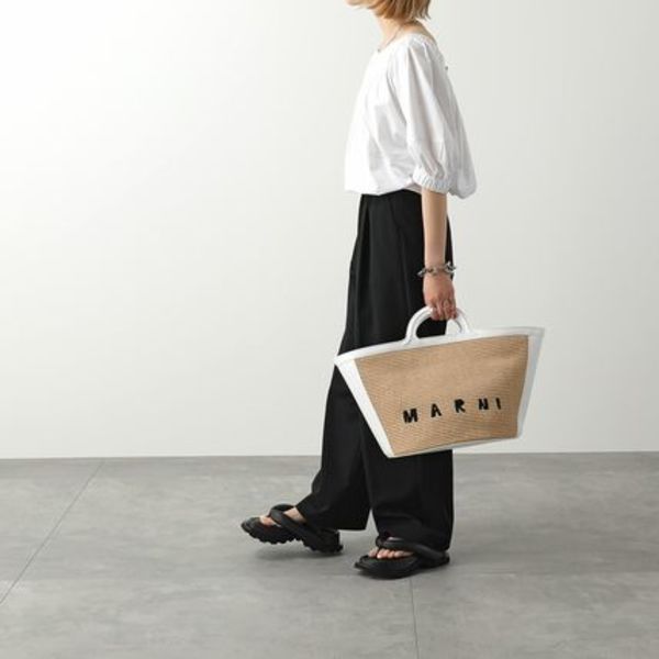 「MARNI」のロゴ刺繍が優しい雰囲気のかごバッグは、コットンとナイロン混紡のなめらかなボディにカーフレザーのトリミングがコントラストを与えます。ショルダーストラップが付いているので2WAYで使用可能。春夏のスタイリングに華を添える一点です。