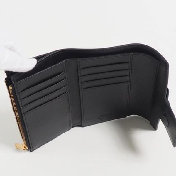 かっちりハンサムな二つ折りレザーウォレットは、8つのカードホルダーを配備するなど収納力抜群。コインケースはジッパー式で見た目によらずすっきりスマートに収まり、小さめのバッグにも入れやすいこと請け合いです。