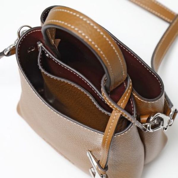▲キズの目立ちにくいハンマードレザーを使用した小さなトートバッグは、シンプルなシルエットでありながらもラグジュアリーな雰囲気が楽しめます。内側は2つのコンパートメントを備えており、機能性にも優れています。