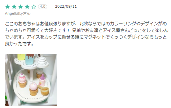 ここのおもちゃはお値段張りますが、北欧ならではのカラーリングやデザインがめちゃめちゃ可愛くて大好きです! 兄弟やお友達とアイス屋さんごっこをして楽しんでいます。アイスをカップに乗せる時にマグネットでくっつくデザインならもっと良かったです。