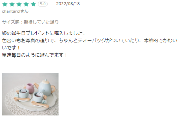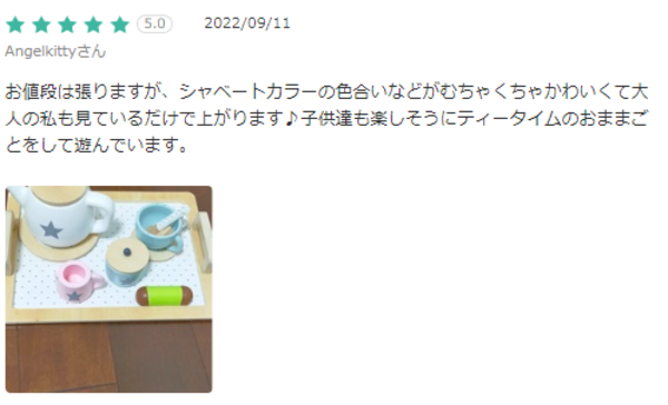 お値段は張りますが、シャベートカラーの色合いなどがむちゃくちゃかわいくて大人の私も見ているだけで上がります♪子供達も楽しそうにティータイムのおままごとをして遊んでいます。