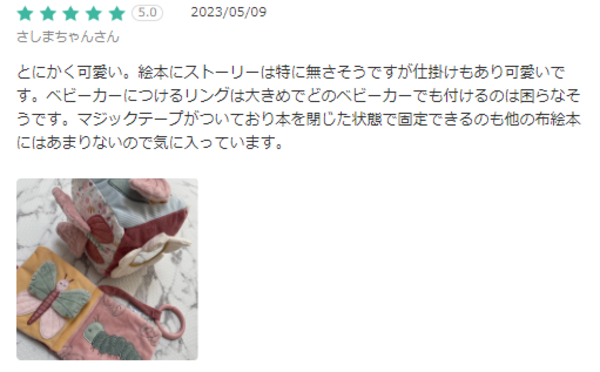 とにかく可愛い。絵本にストーリーは特に無さそうですが仕掛けもあり可愛いです。ベビーカーにつけるリングは大きめでどのベビーカーでも付けるのは困らなそうです。マジックテープがついており本を閉じた状態で固定できるのも他の布絵本にはあまりないので気に入っています。