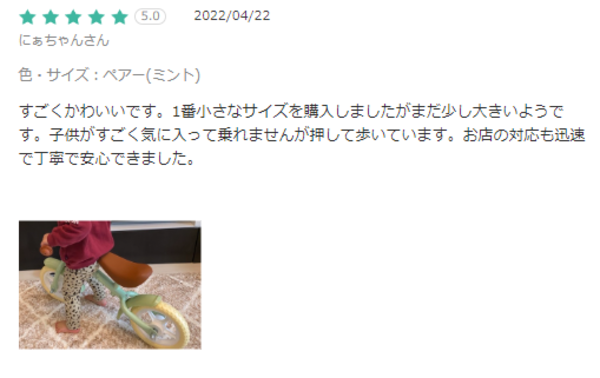 すごくかわいいです。1番小さなサイズを購入しましたがまだ少し大きいようです。子供がすごく気に入って乗れませんが押して歩いています。お店の対応も迅速で丁寧で安心できました。