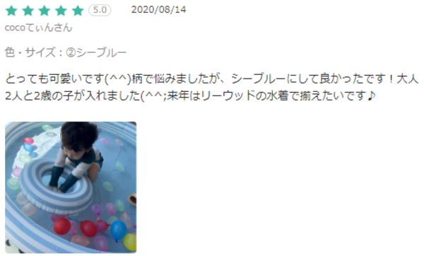 とっても可愛いです(^^)柄で悩みましたが、シーブルーにして良かったです!大人2人と2歳の子が入れました(^^;来年はリーウッドの水着で揃えたいです♪