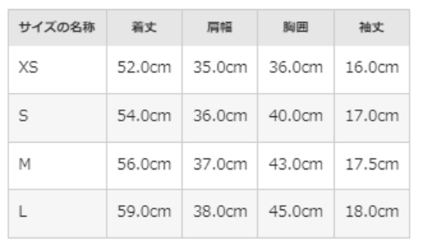 ロゴTシャツのサイズ表