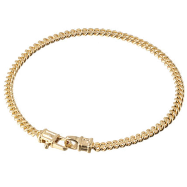 ブランドの刻印が入った留め具をつなげ合わせた程よいボリューム感のブレスレットは、性別を超えたシックな佇まいが楽しめます。