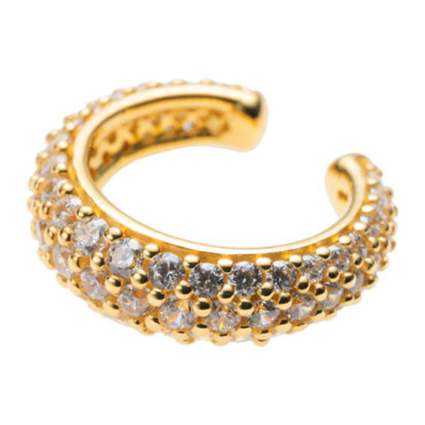 他のイヤリングやピアスと組み合わせても映える気品たっぷりなイヤーカフ。光の反射を受けてラグジュアリーな煌めきを放ちます。華麗でありながらも汎用性の高いデザインのため、オンからオフまでシーンを選ばずにオシャレに使いまわせるアイテムです。