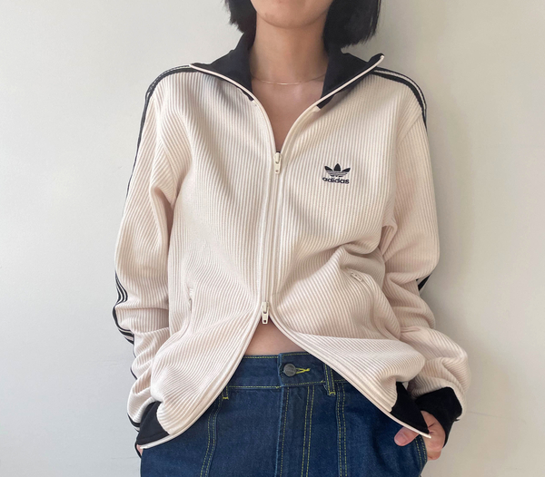 全身をモノトーンで統一したオシャレコーデ!スリーストライプ入りのトラックジャケットは単体でも十分華やかな存在感を放つので、他のアイテムはシンプルデザインのものを合わせるとバランスも良いですね♡