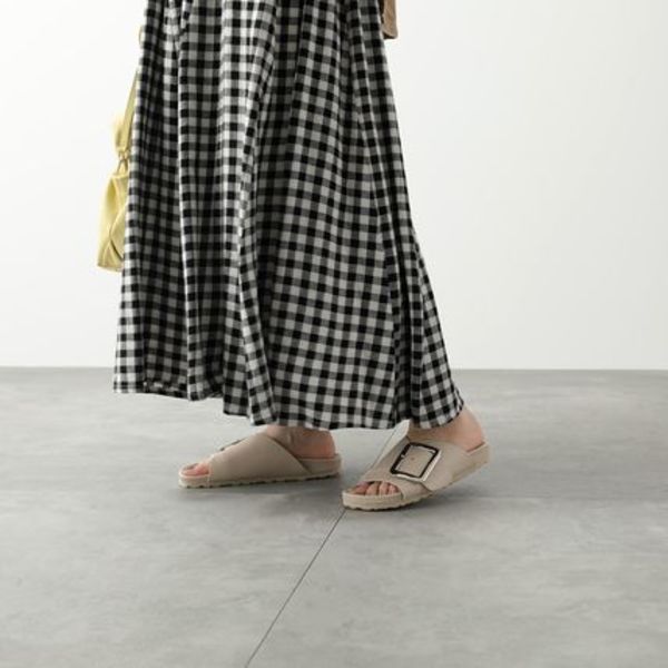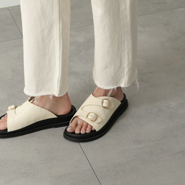 ビッグバックルが特徴的なPLAKTON(プラクトン)のスリッパ型サンダルは、アッパーのデザインがレディな雰囲気。足の形に沿ったソールや、素肌に触れる部分が靴擦れしにくく柔らかな肌触りであることなど、女性に寄り添ったディテールも嬉しい。