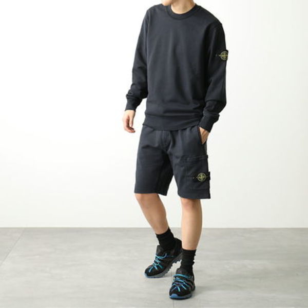 STONE ISLAND(ストーンアイランド)のスウェットハーフパンツは、左に配置されたコンパスロゴが印象的。あくまでシルエットがトレンドに靡くことはなく、着こなし次第で、おしゃれにもただ履いているだけにも見える上級者のアイテムです。