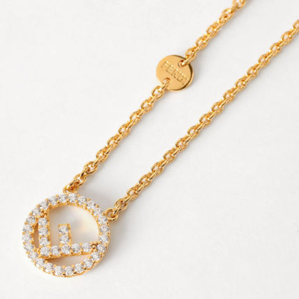 ∟FENDI(フェンディ)のFロゴが光るネックレスは、まさに一生愛せるラグジュアリーなデザイン。肌なじみのいいソフトゴールドと控えめなサイズ感が気品を漂わせています。