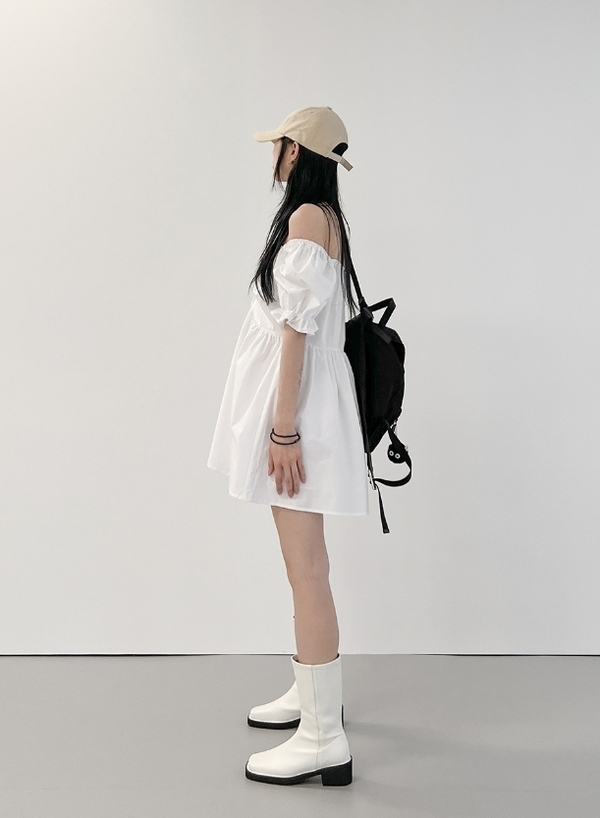 シャーリング×ミニワンピだと、よりトレンド感がアップ。甘くなりすぎないようにCAPやバッグで工夫するのが吉‼
